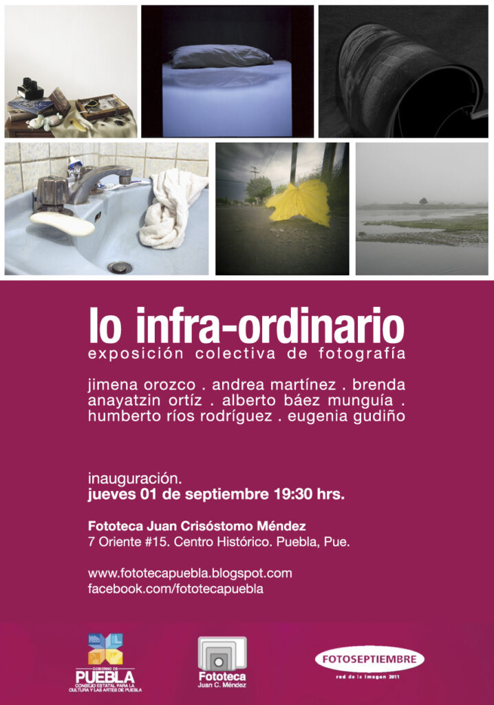 «Lo infra-ordinario» – exposición colectiva – Fototeca de Pueblaoctubre 21, 2025exposición Jueves 1 de septiembre 2011. 19:30 hrs. Fototeca Juan Crisóstomo Méndez Puebla, Pue.